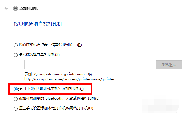 4、点击“使用TCP/IP地址或主机名添加打印机”。