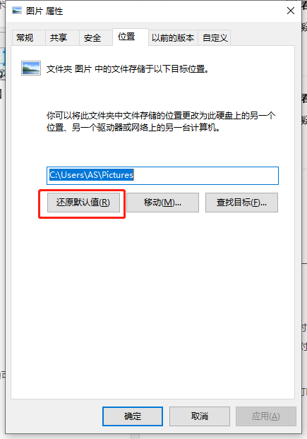 2、切换到【位置】选项卡下,点击【还原为默认值】,点击【应用】,点击【确定】。