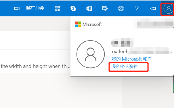 1.打开浏览器,搜索并登陆到outlook邮箱,点击主界面右上角的个人头像,然后点击我的个人资料。