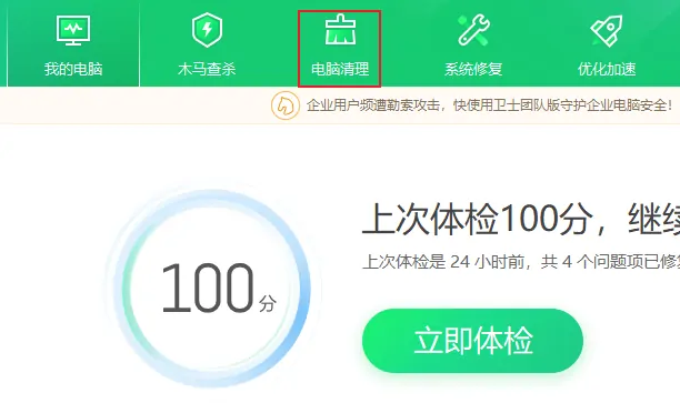 1、首先我们在电脑上下载安全管家,点击页面的电脑清理。