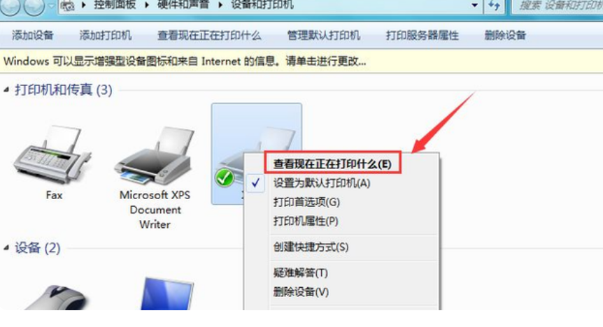 然后点击正在使用的打印机,把脱机使用打印机的勾选去掉;