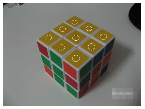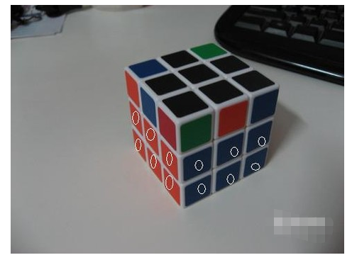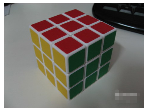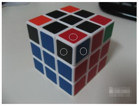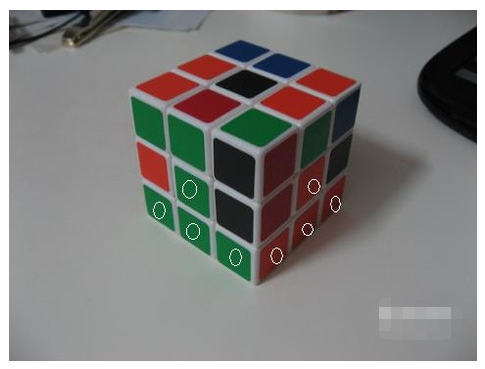 6、四侧面上层两角的方块归位,并不是指颜色要对上,只要这块的颜色和所在的三个面的颜色相对应即可。