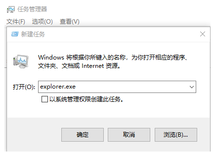 4.在窗口中输入explorer.exe,接着点击确定,就能显示图标了。