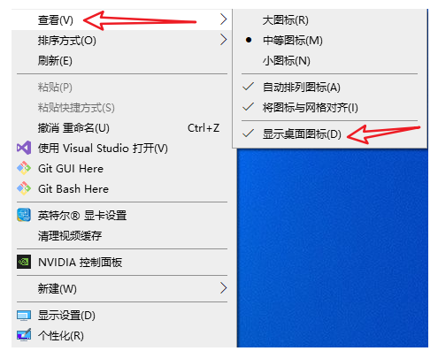 1.在桌面任意一处位置中按下鼠标右键,点击查看。在查看菜单里,勾选显示桌面图标。这时桌面的图标就出现了。