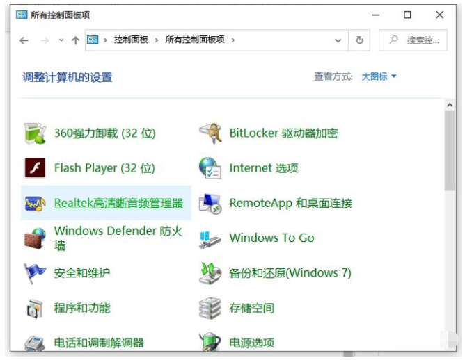 2、打开控制面板,将查看方式更改为大图标,随后选择Realtek高清晰音频管理器。