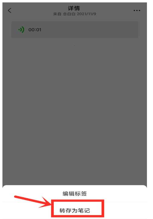 3、在收藏中打开这条语音,然后点击上方三个小点,选择【转为笔记】。