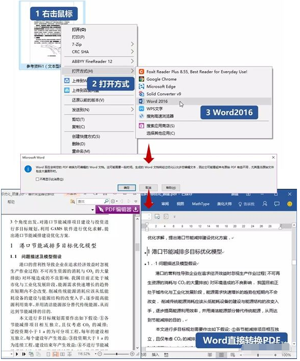选中想要转换的 PDF 文档,鼠标右击选择用Word2013或2016 打开。这时Word弹出提示正在努力地转Word,但转换之后可能会和 PDF有点差异。不管,我们直接点确认就行。耐心等待过后,PDF就能转换为Word 了,不过复杂的文档可能会有些乱码的情况。