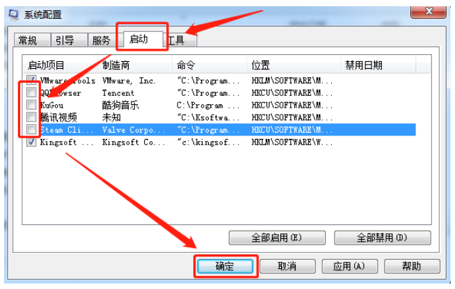 6.随后切换成“启动”选项卡,取消勾选不用的程序,点击确定,最后重启电脑即可。