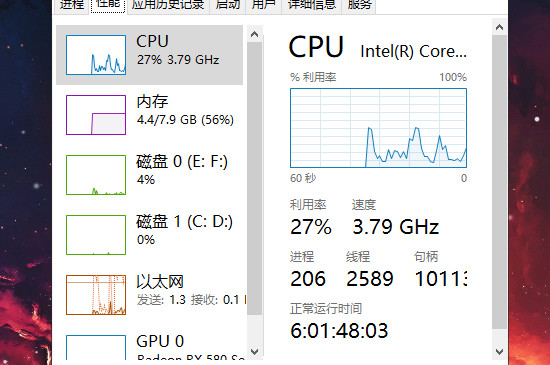 2、查看基本性能,打开任务管理器之后点击上方的菜单栏,点击“性能”之后就可以进入跳转的页面。此时可以看到cpu的主频、核心数、一级缓存、二级缓存等参数。