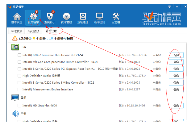 3、点击【驱动程序】下的有个【备份还原】的功能,进行备份文件