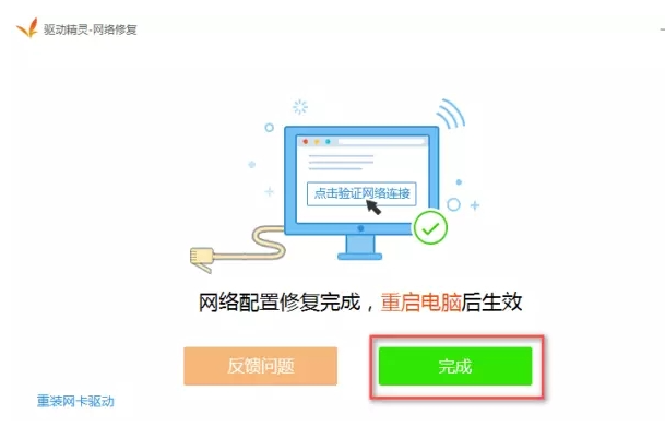 5、修复完点击完成并重启电脑,此时网卡驱动已经成功修复。