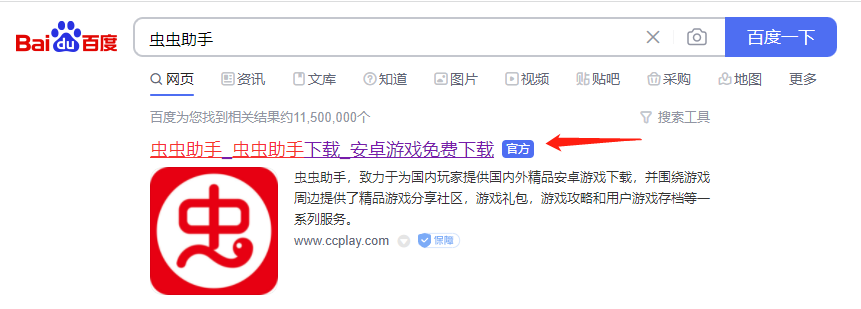1、在浏览器中搜索虫虫助手,选择并进入带有“官方”字样的网站。