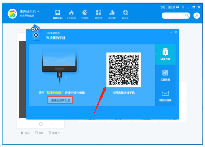 2、如果这时手机已经通过数据线与电脑进行连接了,但是360手机助手并没有连接成功的提示,那么这时点击【连接但没有反应】按钮。
