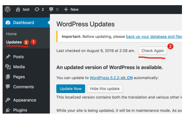 2、进入WordPress网站后台,在Updates选项里面再次检测更新Check Again。
