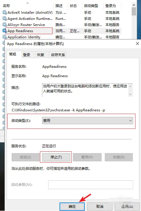 4、找到 “AppReadiness”服务并双击“停止”,启动类型改为“禁用”,点击确定后重启电脑即可修复。