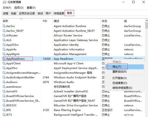 2、点击“服务”选项,找到“AppReadiness”服务,鼠标右键点击停止。