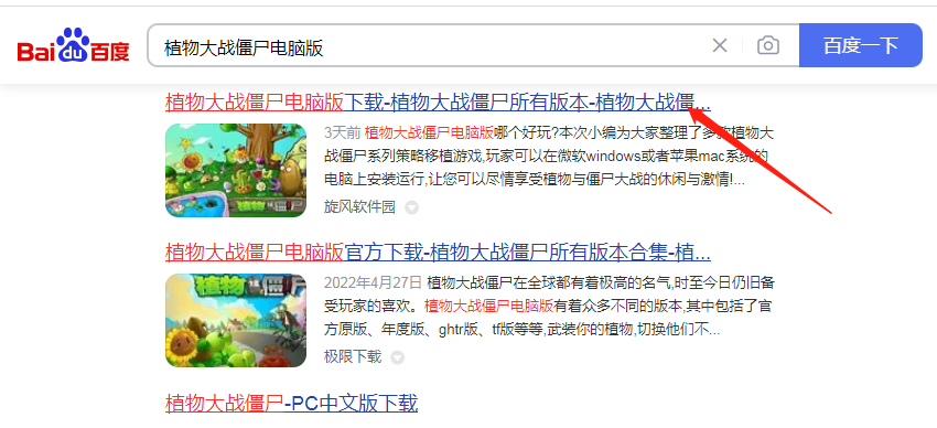 1、浏览器百度并搜索植物大战僵尸电脑版,然后下载。