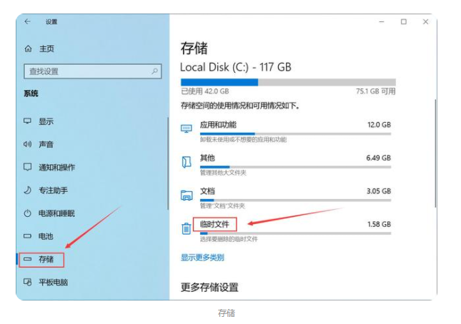 2、点击“存储”,然后右侧点击“临时文件”。