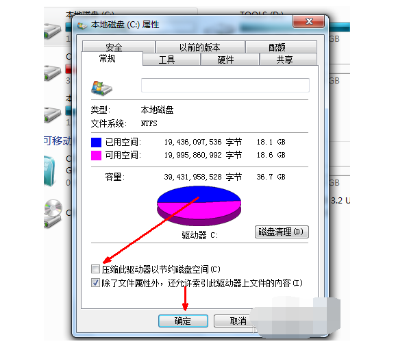 6、如果电脑的磁盘空间太小,还可以在属性页中选中压缩驱动器来节约磁盘空间,通过这种途径可以一定程度上节约空间。