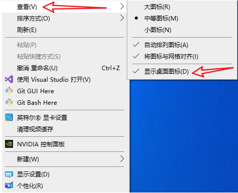1.首先桌面空白处按下鼠标右键,再点击查看,在查看下的菜单里,将显示桌面图标打上勾。这时候桌面的图标就出现啦。
