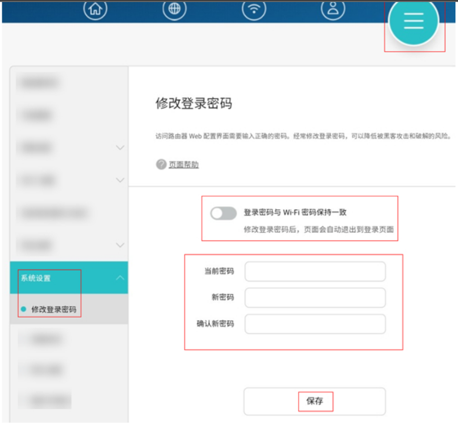 2、进入后依次打开更多功能 > 系统设置 > 修改登录密码。在新密码中输入重新想设置的新密码并确认新密码,点击保存即修改完成。