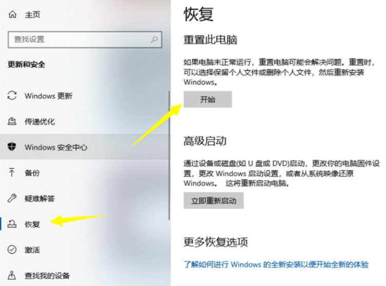 2、在左侧栏目上找到恢复,然后选择重置此电脑下面的开始选项,就可以开始执行恢复系统的操作了。