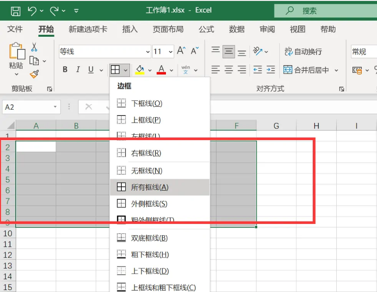 2、点击”开始→框线“,下拉选择所有框线,选中单元格区域添加上表格框线。