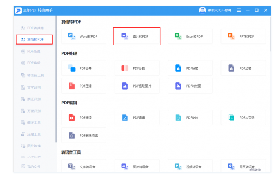 1、下载并运行全能PDF转换助手,点击【其他转PDF】后,选择【图片转PDF】。