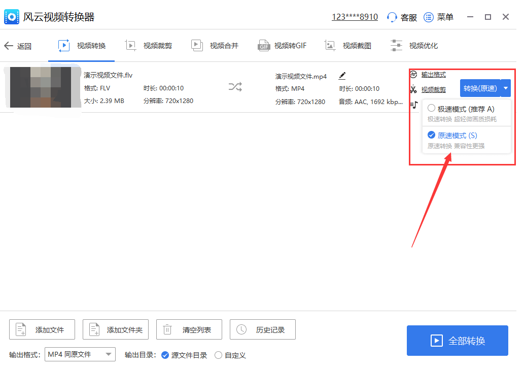 6、完成以上步骤都后,点击转换旁边的倒三角,将画质设置为“原速模式”,这样可以确保视频的兼容性更强。