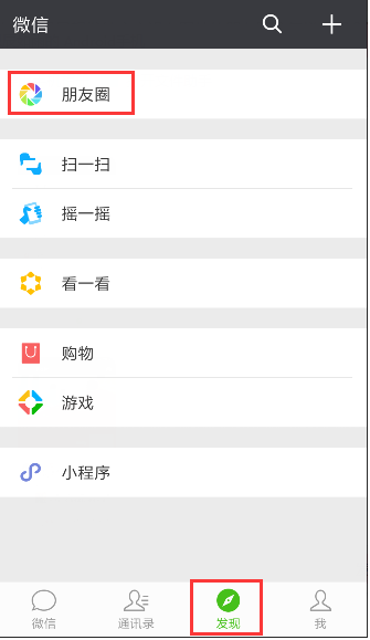 1、打开手机微信,点击“发现”——“朋友圈”进入。