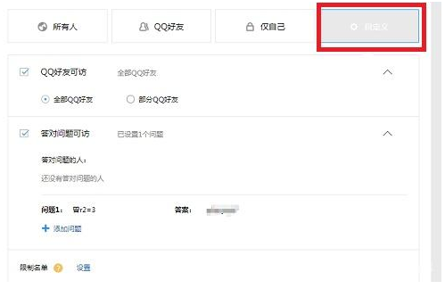 4、“自定义”模式:可以QQ空间设置问答,只有知道的答案的QQ用户才能访问自己的QQ空间。