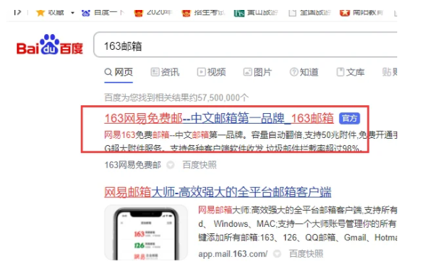 1、在电脑的百度上输入163邮箱,找到其官方网站以后点击进入。
