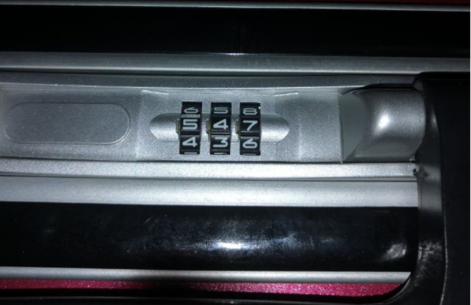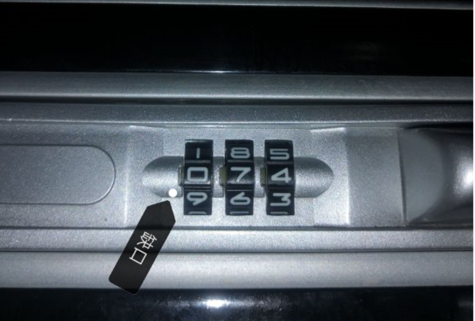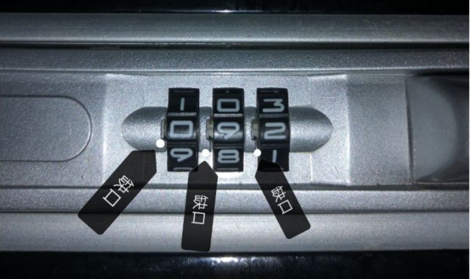 1、首先拿出行李箱密码箱,在光线好的地方从密码转轮的缝隙看去,拨动密码转轮,这时可以看到有一个缺口(凹进去的)。如图:数字7和4缝隙都是正常的,数字0缝隙那个是缺口(凹进去的)。