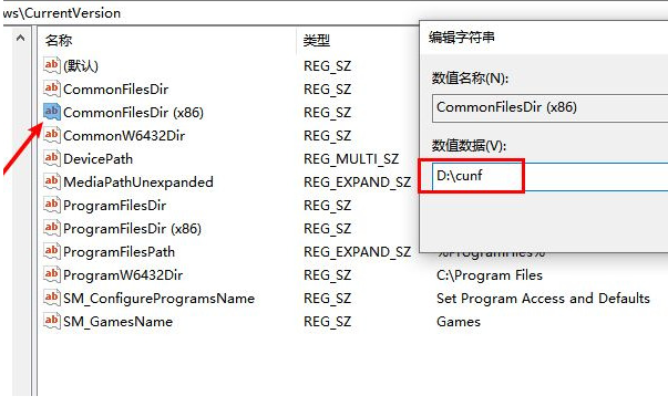 5、在右侧的窗口内找到并用鼠标双击“CommonFilesDir (x86)”文件,打开窗口后输入D盘的存放路径;