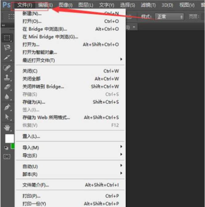 3、如果想要打开不那么麻烦的话,进入Photoshoop后,点击左上角的文件。