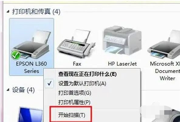 2、我们将需要扫描的文件有字页面朝下放置在该打印机盖板下面。来到电脑的设备和打印机列表页面后,选中该打印机鼠标右键点击,选择开始扫描进入。