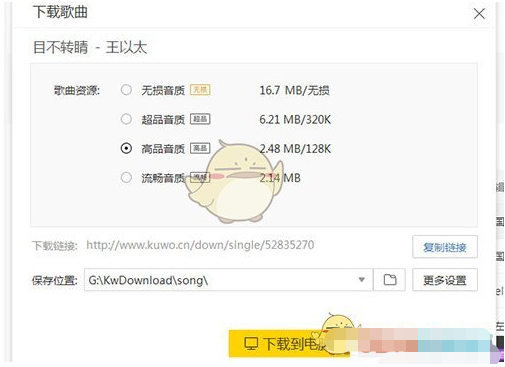 2、这时将会出现下载歌曲的具体情况,根据自己需求选择歌曲资源的歌质,再对保存位置进行设置,点击【下载到电脑】。
