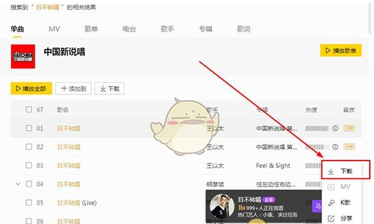1、首先打开酷我音乐电脑版,先通过上面的搜索框搜索找到自己想要下载的歌曲,点击选中我们想要下载的歌曲,点击最后方的下载键(下图红色箭头所指向的地方)。