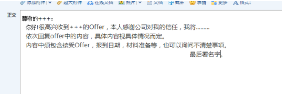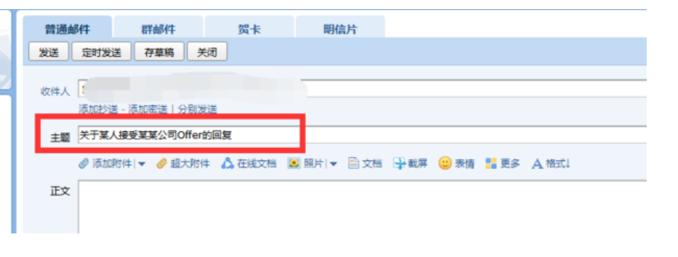 2、将回复主题改为“关于某人接受某某公司Offer的回复”。