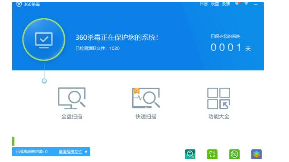 1、打开360杀毒软件,进入软件主界面,软件主界面提供全盘扫描、快速扫描、功能大全三个选项。
