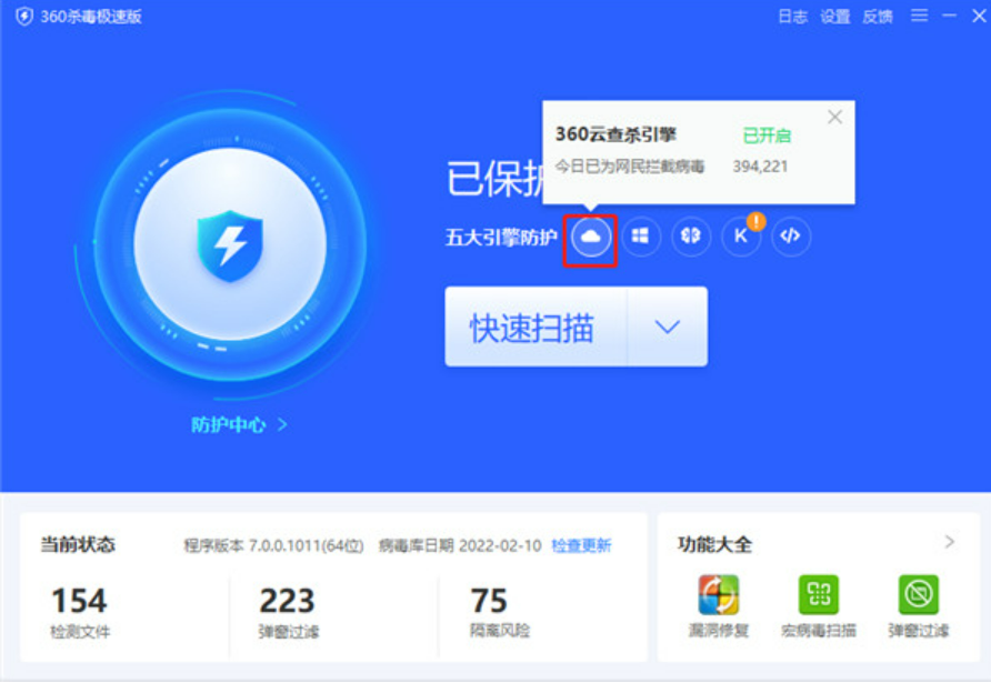 3、 我们在360杀毒软件极速版的上方的图标中,点击图标会提示该防护已经开启。保护电脑,减少病毒的威胁。