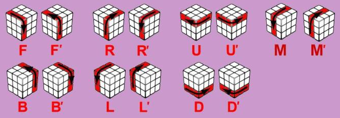 2、接下来用字母来表示要转动的1层或1面,以及方向,比如:F(代表前面顺时针转90度),F`(代表前面逆时针转90度),R2(代表右面顺时针转2次90度)。