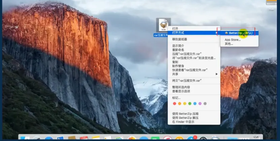 1、找到RAR压缩文件右键打开,选择“打开方式”,选择“BetterZip”打开。