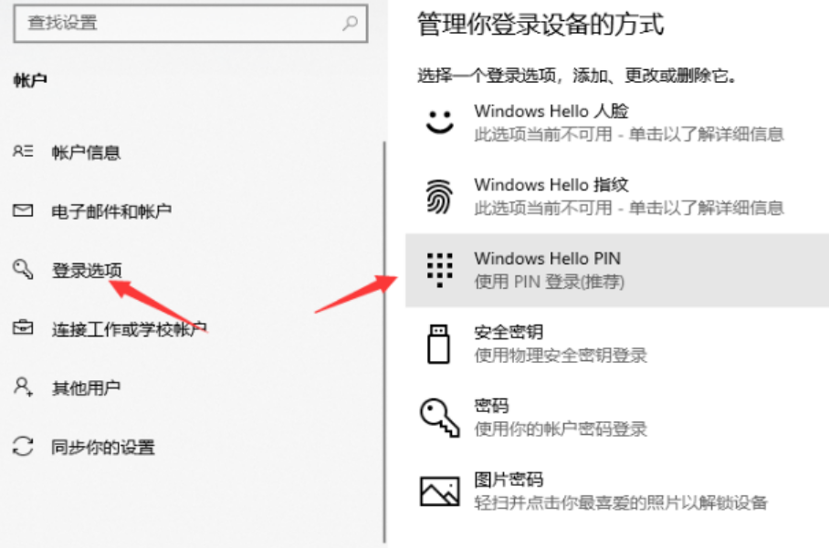 3、点击左侧的“登录选项”,再点击右侧的“windows hello pin”,然后设置添加pin码,设置完pin码后就能成功开启了。