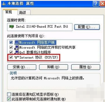 4、点击打开“本地连接属性”对话框,在“常规”选项卡的此连接使用下列项目列表框中点击“Internet 协议(TCP/IP)”项目。