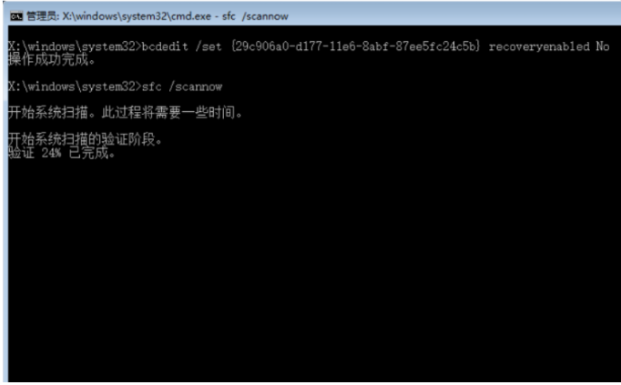 6、再输入【sfc / scannow】,将会开始扫描,验证以及修复系统文件,完成所有操作,重新启动电脑即可正常进入。