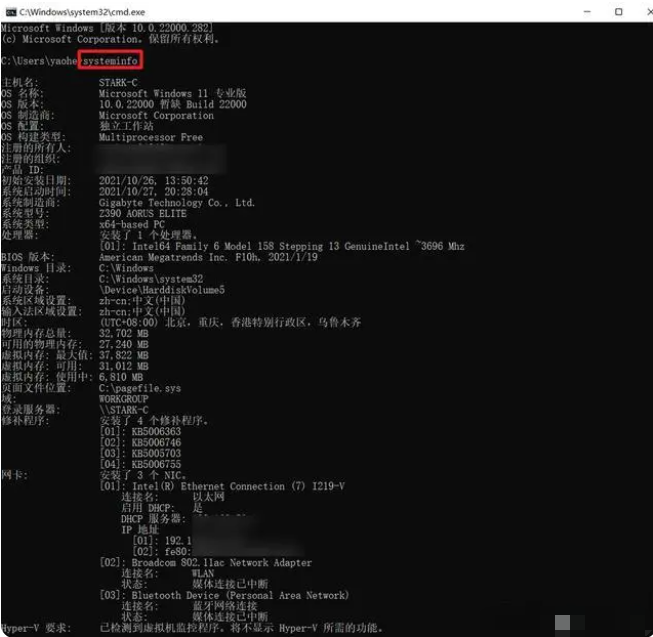 2、输入“systeminfo”命令回车键后,即可显示信息的基本信息。相比方法一,补充了物理及虚拟内测的详细数值,以及网卡的参数信息等,还显示了系统的一些信息和主板的BIOS版本等。