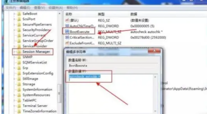 3.接着在右侧找到并双击打开【BootExecute】项,然后在弹出的界面中将数值数据设置为【 autocheck autochk *】,最后点击【确定】即可。