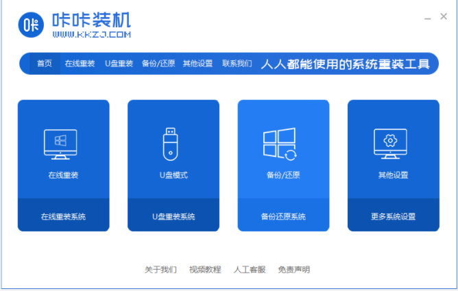 1、首先我们msdn官网上下载好我们需要的iso系统镜像保存在电脑非系统盘上,接着下载安装咔咔装机一键重装系统软件并打开,点击备份还原。