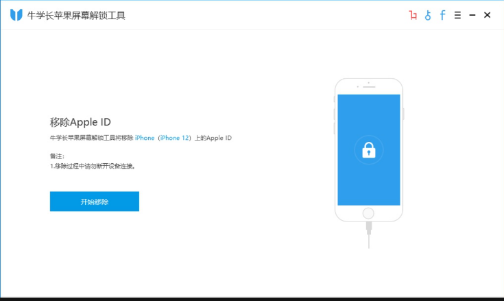(1)首先下载安装好牛学长苹果屏幕解锁工具,启动程序之后出现三个功能选项,选择“移除apple id”功能进入其中。